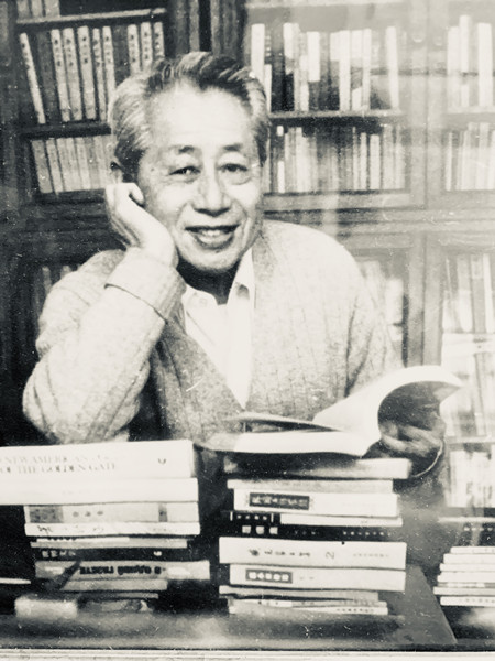 1988年6月19日,愛(ài)潑斯坦(前排右一)和夫人黃浣碧、美國(guó)老友安布德大夫和夫人蘇菲亞、文化部副部長(zhǎng)姚仲明(后右二)和朱子奇、陸璀合影于菊兒小院。
