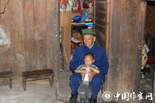 一位大爺抱著小孩在老房子門(mén)口留影。