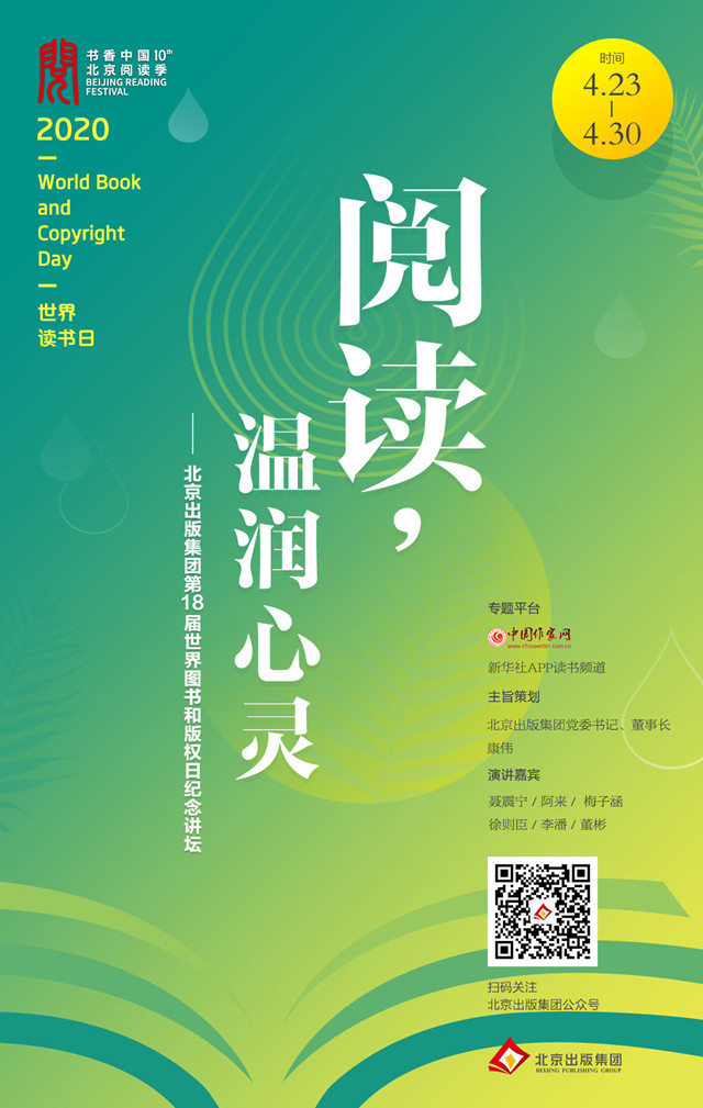 2020年“世界圖書和版權(quán)日”,北京出版集團推出“閱讀,溫潤心靈——北京出版集團第18屆世界圖書和版權(quán)日紀(jì)念講壇”,以閱讀的方式,在文化與科技高度融合發(fā)展的5G時代中,履行出版企業(yè)的文化使命和責(zé)任擔(dān)當(dāng),廣邀名家學(xué)者相約線上閱讀分享,共品書香,共話人生。希望書香里的安靜篤定能傳遞給人們溫暖與力量,驅(qū)散陰霾、燭照人心。