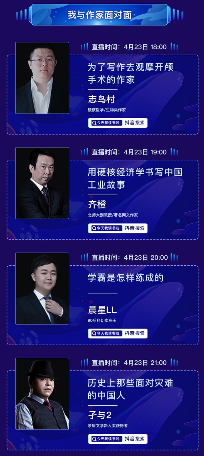 來自閱文的多位作家做客抖音直播間,分享他們的寫作故事與讀書體會(huì)。同時(shí),雙方還在QQ閱讀平臺(tái)推出多個(gè)閱讀專區(qū)、開放大批抗疫主題優(yōu)秀作品資源。23日當(dāng)晚,“今天我讀書啦”活動(dòng)將在抖音平臺(tái)開啟,閱文旗下“齊橙”、“志鳥村”、“晨星LL”和“孑與2”四位作家將亮相直播間。