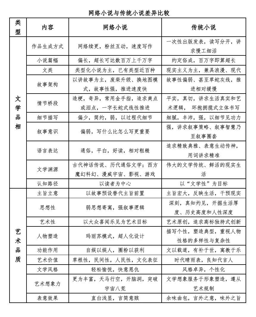 其二,正是作家站位和創(chuàng)作動機的不同,致使網(wǎng)絡文學在文學品相和藝術(shù)品質(zhì)上與傳統(tǒng)文學形成明顯落差。為了敘述的方便,我們試列表以直觀陳示: