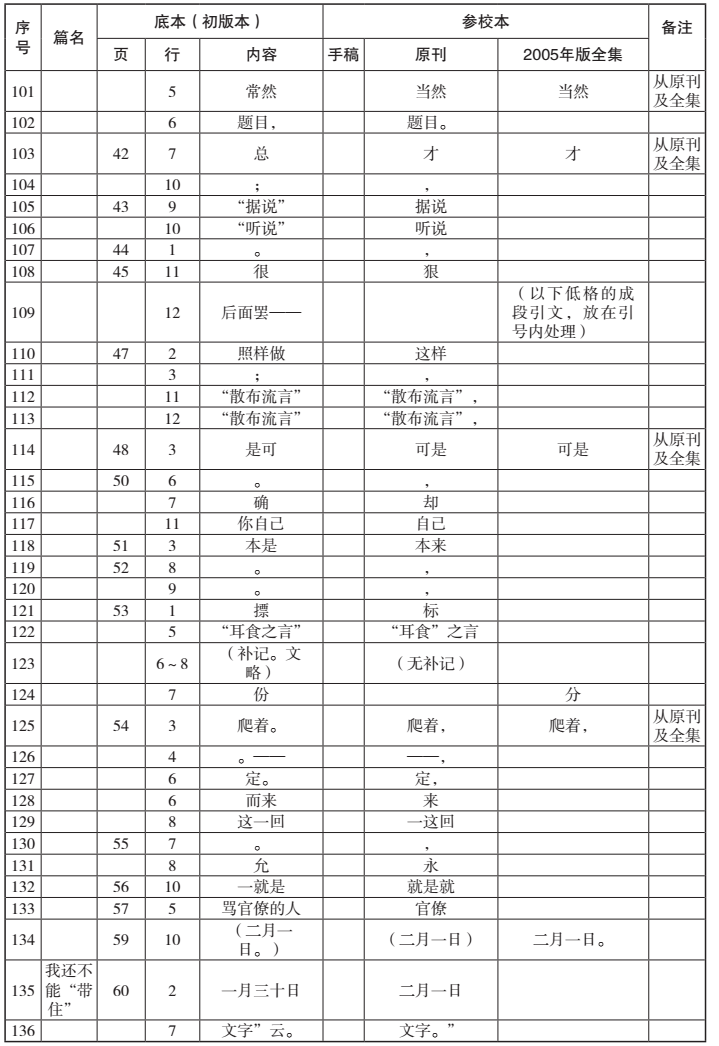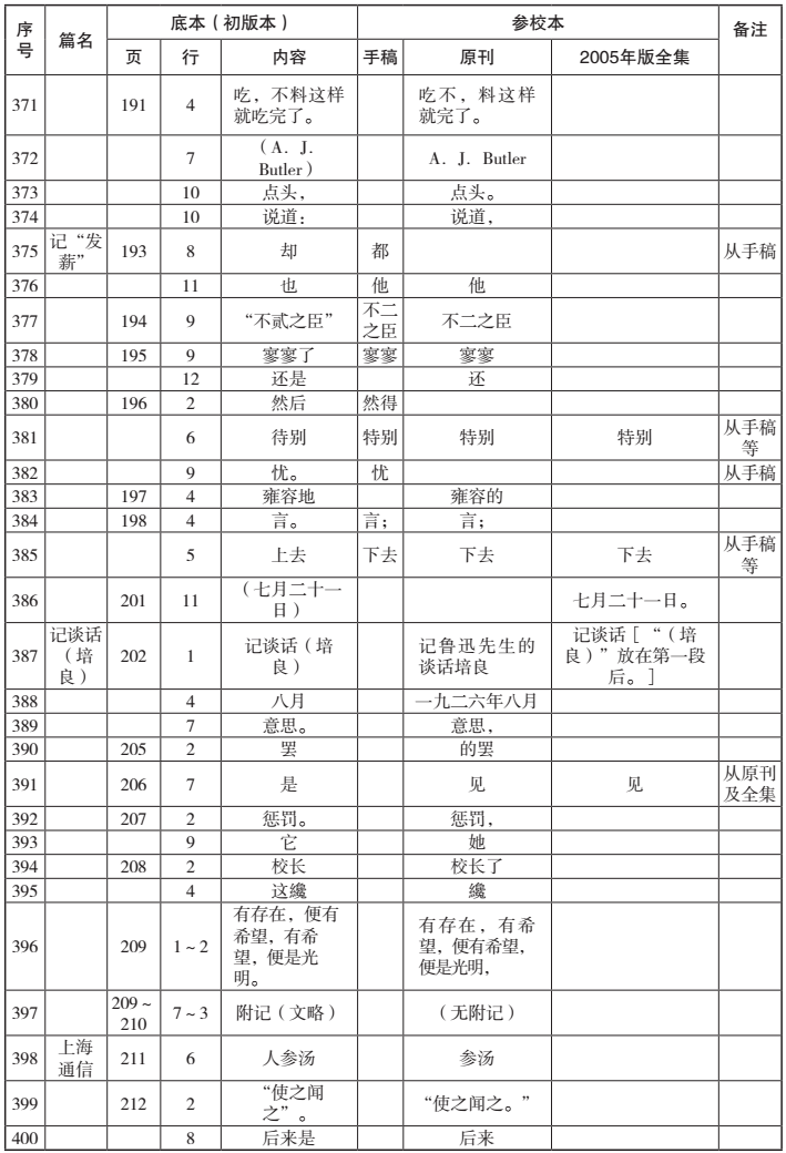 如此就完成了第一遍匯校工作。第二遍則參考現(xiàn)有??背晒槁┭a缺。重點是對照孫用先生《魯迅全集校讀記》(1982年版)中的《〈華蓋集續(xù)編〉校讀記》,以及自2005年版《魯迅全集》出版以來學界公開發(fā)表的校勘成果中所有與《華蓋集續(xù)編》有關(guān)的部分,對相關(guān)文本進行復(fù)核,確認個人失校的案例,將其補充進匯校表,以使工作相對完善。