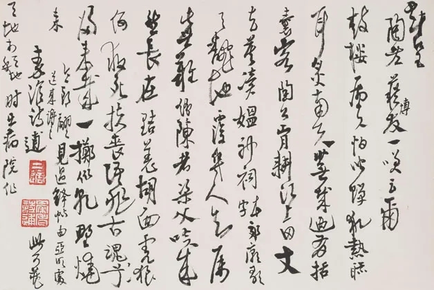 靜靜凝視高二適的書法遺墨,那靈異的墨線,似高猿悲叫,亂水潛奔,這是流淌在古典詩文和經(jīng)典碑帖中的心靈對晤,是意與古會的神異契合。在筆力彌滿、意態(tài)天矯,行氣淋漓的筆勢中透映出一位傳統(tǒng)文人的自我風(fēng)神。從“赴速急就稱奇觚,鬼哭神驚運(yùn)思初”的詩句里,流露出他作書時“筆所未到氣已吐”的豪邁心象。高二適的書法意象以氣勢開張、書蘊(yùn)“詩意”為基調(diào),以其精湛的筆墨古法、深厚淵深的文史修養(yǎng)和特立高潔的文人風(fēng)骨幻化熔鑄,開古典主義之新境,堪稱傳統(tǒng)書法草書一脈的浪漫主義大師。