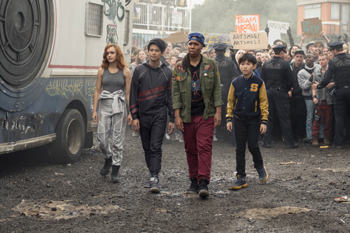 影片的視覺表現(xiàn),進一步強化了間離效果。其中的現(xiàn)實世界是四維呈現(xiàn),而游戲世界以動畫的方式三維呈現(xiàn)。在游戲世界中,所有角色以及環(huán)境都具有鮮明的“3D建模”痕跡,現(xiàn)實世界由此與游戲世界得以被直觀地區(qū)分。此外,在游戲世界中作為第四維度的時間也被模糊化,玩家甚至可以使用澤米基斯魔方之類的游戲道具使時間回溯。這使游戲世界建構(gòu)起與外在現(xiàn)實涇渭分明的獨立世界觀。為了保持這種間離效果,影片更是不斷地打破游戲內(nèi)空間的連續(xù)性。華麗的游戲世界雖是敘事主體,但“廢土科幻”風(fēng)的現(xiàn)實影像始終穿插于游戲影像之間,將游戲夢幻的完整統(tǒng)一支解,以免觀眾沉浸在奇妙瑰麗的超現(xiàn)實游戲世界。