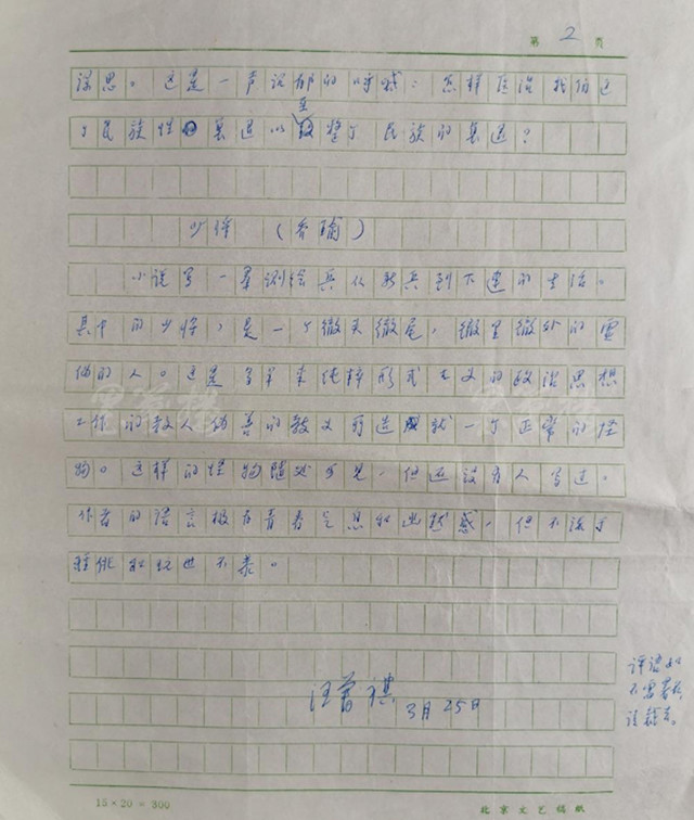 如上文所述,汪曾祺被聘為此次活動(dòng)評(píng)委的時(shí)間是1988年11月,那么這個(gè)手稿的寫作時(shí)間就應(yīng)該是次年即1989年的3月25日了。因?yàn)檫@三則評(píng)語(yǔ)的“出土”,今后研究者在重新編撰或修訂汪曾祺年譜時(shí)就應(yīng)該補(bǔ)上這一筆才是。