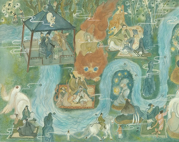 澎湃新聞:在書中“曲水流觴”場景的兩個大拉頁上,人物之間出現(xiàn)了很多動物和神獸的形象,有些畫面占比還非常大,這個設計是有什么特別用意嗎?