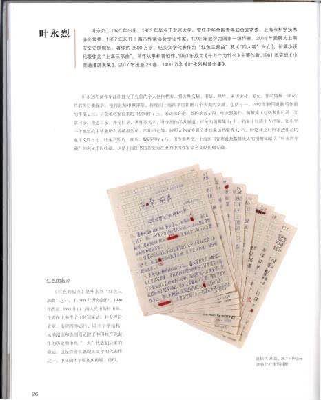 在半個(gè)多世紀(jì)的創(chuàng)作生涯中,葉永烈建立了完善的個(gè)人創(chuàng)作檔案,各種文稿、書信、照片、采訪錄音、筆記,作品剪報(bào)、評(píng)論、樣書等均分類保存。葉永烈長(zhǎng)期從事中國(guó)當(dāng)代重大政治題材紀(jì)實(shí)文學(xué)的創(chuàng)作,積累了大量的檔案和口述歷史資料,形成了相當(dāng)規(guī)模的“葉永烈創(chuàng)作檔案”,成為中國(guó)當(dāng)代歷史研究的一批原始文獻(xiàn)。