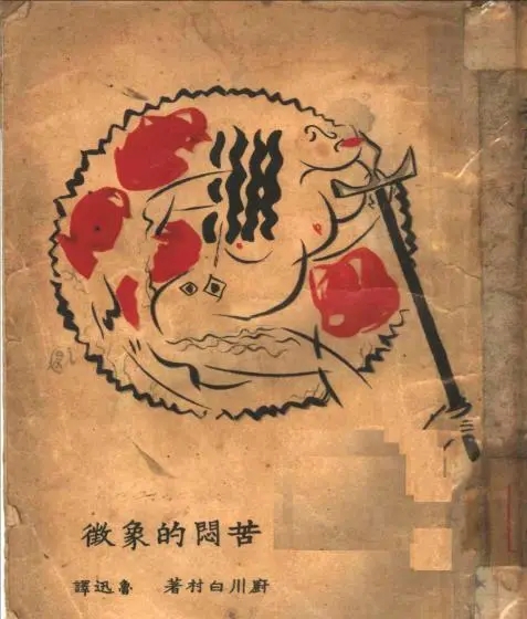 1924年,魯迅譯作《苦悶的象征》的封面亦出自陶元慶之手。陶元慶到北京后不久,許羨蘇即在魯迅處提及此人。魯迅又向許欽文詳細(xì)詢問了陶元慶的情況,對其繪畫風(fēng)格有了基本了解后,便托請許欽文邀他為《苦悶的象征》繪制封面,這是兩人多次合作中的第一次。封面的基本構(gòu)想是頭發(fā)蓬亂的少女舔舐手中的一柄镋叉,所有元素均由曲線線條抽象凝練而成,包孕在圓形輪廓中,融入日本圖案風(fēng)格,頗具象征意味;色彩主要由黑、藍(lán)、紅三色構(gòu)成,對比度極高。