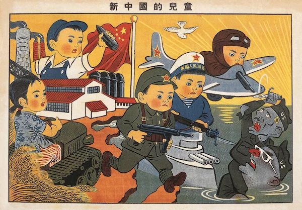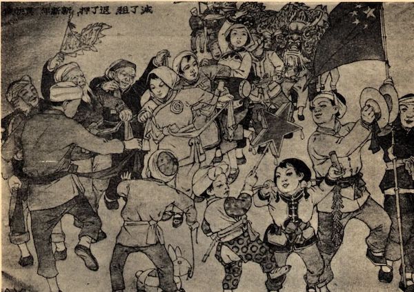 在1949年以來的美術(shù)創(chuàng)作中,有很多以兒童為題材的美術(shù)作品,其中有很多人們熟悉的兒童游戲。這些不同形式的畫曾經(jīng)在民間有著廣泛的影響,并與社會(huì)政治和社會(huì)發(fā)展緊密關(guān)聯(lián),反映了這一時(shí)期兒童題材美術(shù)創(chuàng)作的特點(diǎn)。其中以“娃娃戲”的形式來表現(xiàn)的兒童的生活,延續(xù)了延安以來的傳統(tǒng)。1947年,馮真在延安的“大眾美術(shù)社”創(chuàng)作了《娃娃戲》《參軍》,在當(dāng)時(shí)的印刷量就高達(dá)60萬份。誕生于革命根據(jù)地的《娃娃戲》,不是傳統(tǒng)“娃娃戲”中多子多福的寓意,而是有著鮮明的政治主題,是革命機(jī)器中的齒輪和螺絲釘。而這種表現(xiàn)兒童模仿戲?。ㄆび皯蚧蚩軕颍┑膱鼍?,曾經(jīng)是革命根據(jù)地生活中常見的景象,反映了新文化民眾宣傳的潮流。這種好人與壞人的裝扮表演,又類同于當(dāng)時(shí)流行的街頭“活報(bào)劇”。1950年,張仃創(chuàng)作的《新中國的兒童》,以新中國兒童裝扮成海陸空軍以及工農(nóng)的形象,表現(xiàn)了新中國兒童在新社會(huì)的政治態(tài)度和立場,是這一時(shí)期最典型、最有影響的代表作,是延安傳統(tǒng)在新中國的發(fā)展。