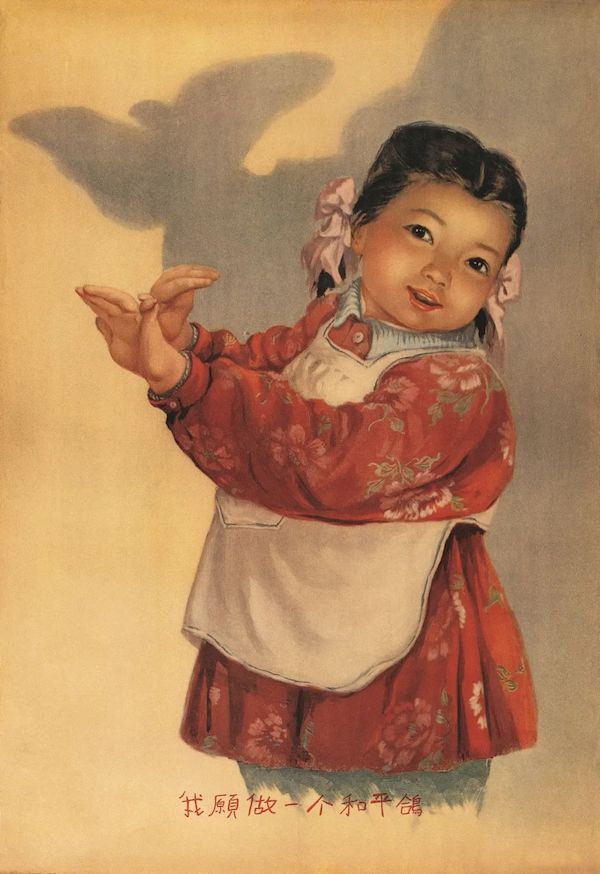 方菁的《我愿做一個(gè)和平鴿》(1961年),是當(dāng)時(shí)深受歡迎的一幅年畫。畫面中的小女孩用雙手通過燈的投影而成和平鴿的影像,也是表現(xiàn)時(shí)代主題的一種方式。50年代初抗美援朝時(shí)期的和平簽名運(yùn)動(dòng),以及朝鮮戰(zhàn)爭結(jié)束之后人們對于和平生活的期盼,都是這一時(shí)期美術(shù)創(chuàng)作的重要主題。這一通過光影的游戲,還可以投影出其它動(dòng)物,是一種益智游戲。只不過通過游戲而反映的時(shí)代主題,攝取了人們生活中的日常,而繪畫又像教科書那樣指導(dǎo)其他孩子去模仿,去創(chuàng)造。