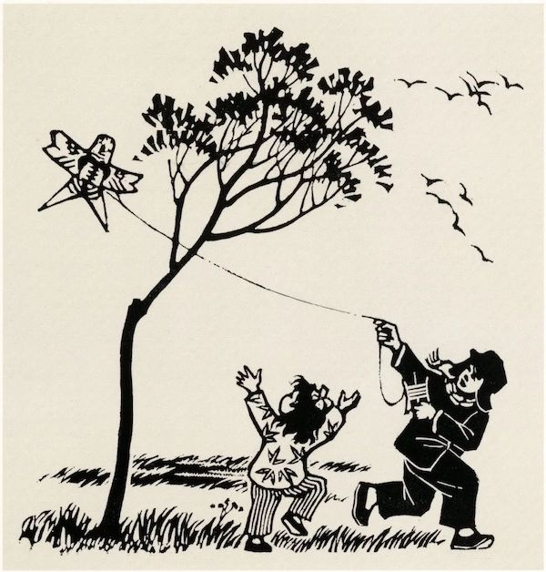 放風(fēng)箏是孩子們最喜歡的放飛心情和理想的游戲。李樺的《春日》(1961年)所表現(xiàn)的放風(fēng)箏的孩子,其優(yōu)美的動(dòng)態(tài)與飛翔的風(fēng)箏和飛鳥所構(gòu)成的動(dòng)勢,是李樺在新中國完善版畫轉(zhuǎn)型的具體努力。這類表面上沒有政治主題的兒童生活的表現(xiàn),實(shí)際上還是表現(xiàn)出了新中國美術(shù)創(chuàng)作所要求的反映新時(shí)代的需求。