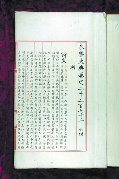 眼前這冊《永樂大典》與程有慶在國圖地庫中看到的《永樂大典》一模一樣。袁女士這冊《永樂大典》是“?!弊猪嵉摹昂弊?,內(nèi)容是與“湖”字有關(guān)的部分。此前,國圖已經(jīng)收藏了兩冊“湖”字單冊,在程有慶印象中,中間正好缺這一冊。不過為了保險起見,他立刻打電話給曾在中華書局工作的父親,請他幫忙查一下已發(fā)現(xiàn)《永樂大典》的存目。