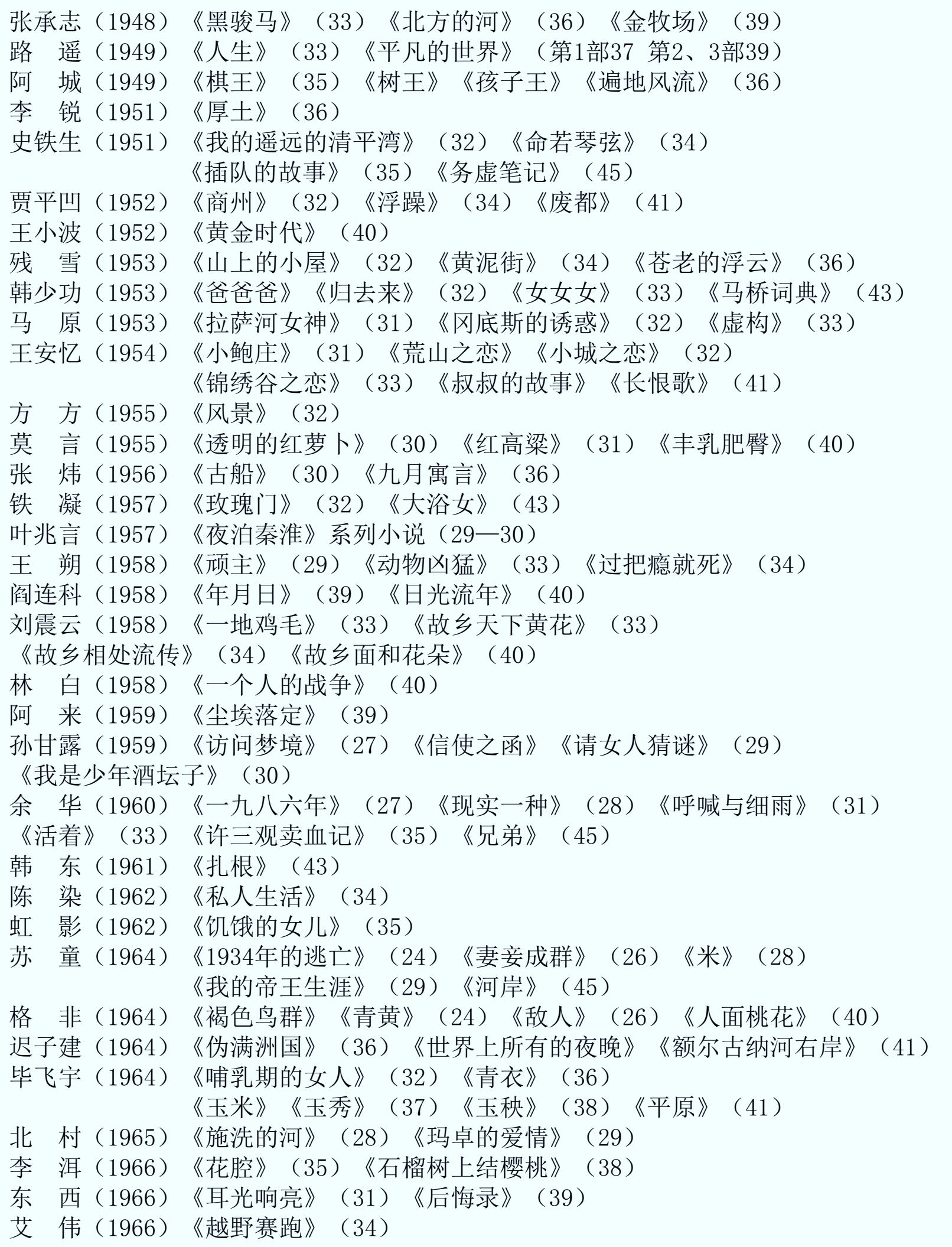 何平統(tǒng)計(jì)的新時(shí)期以來部分知名作家發(fā)表代表作時(shí)年齡表(注:姓名后數(shù)字為出生年份 作品后數(shù)字為該作品的首發(fā)時(shí)作者的年齡)