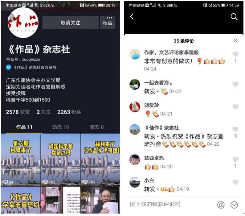 《作品》雜志抖音頁面及網(wǎng)友評論