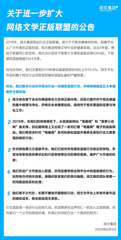 6月5日,閱文集團發(fā)布關于進一步擴大網絡文學整版聯(lián)盟的公告,展現(xiàn)一系列打擊盜版成果,并推五大實質舉措打擊盜版。