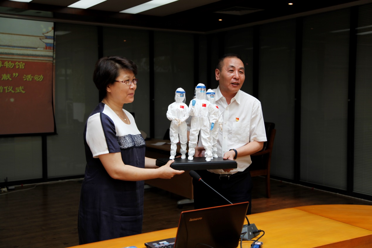 捐贈儀式上,肖維平介紹,“非凡抗疫,北京記憶”抗擊新冠肺炎文獻征集活動是首都圖書館為守護全民抗疫的時代記憶,做好特殊時期的記憶保存,傳遞抗疫正能量,充分履行圖書館“收集、整理和保存承載中華民族精神和時代記憶文獻資料”職責使命的重要舉措。自今年2月27日面向全市開展征集,已相繼收到熱心讀者捐贈的音視頻、圖片、文字、書畫作品等各類文獻700余件。北京工藝美術(shù)博物館此次向“非凡抗疫,北京記憶”抗擊新冠肺炎文獻征集活動捐贈的物品包括書畫作品、醫(yī)護人員形象絹人(石榮祿《祈福武漢 天佑中華》書法作品與馬燕平《最美逆行者》絹人擺件)、工藝美術(shù)相關(guān)視頻98段、活動倡議書等,均來自“遙祝武漢 匠心奉獻”公益活動。