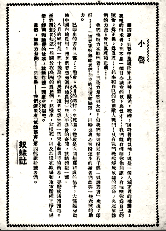容光書局版《生死場(chǎng)》附頁(yè)奴隸社《小啟》