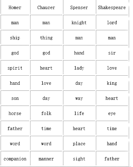 通過這樣的表格可以發(fā)現(xiàn),荷馬、喬叟、斯賓塞、莎士比亞的風格與他們所處時代的變遷得到了一種獨特的呈現(xiàn),通過主題詞的變遷,我們能夠窺見不同時代的文學主題與不同作家的文本主題,達成對一位作家語言無意識的理解。就名詞而言,在莎士比亞的所有文本中,愛是出場率第四高的名詞,只有主(lord)、人(man)和先生(sir)三個詞出場率高于愛,而其他三位作家所使用的最高頻名詞則沒有愛(love),無論莎士比亞是偉大的愛情謳歌者,還是偉大的愛情質疑者,愛都是其一個重要表現(xiàn)和反思主題。