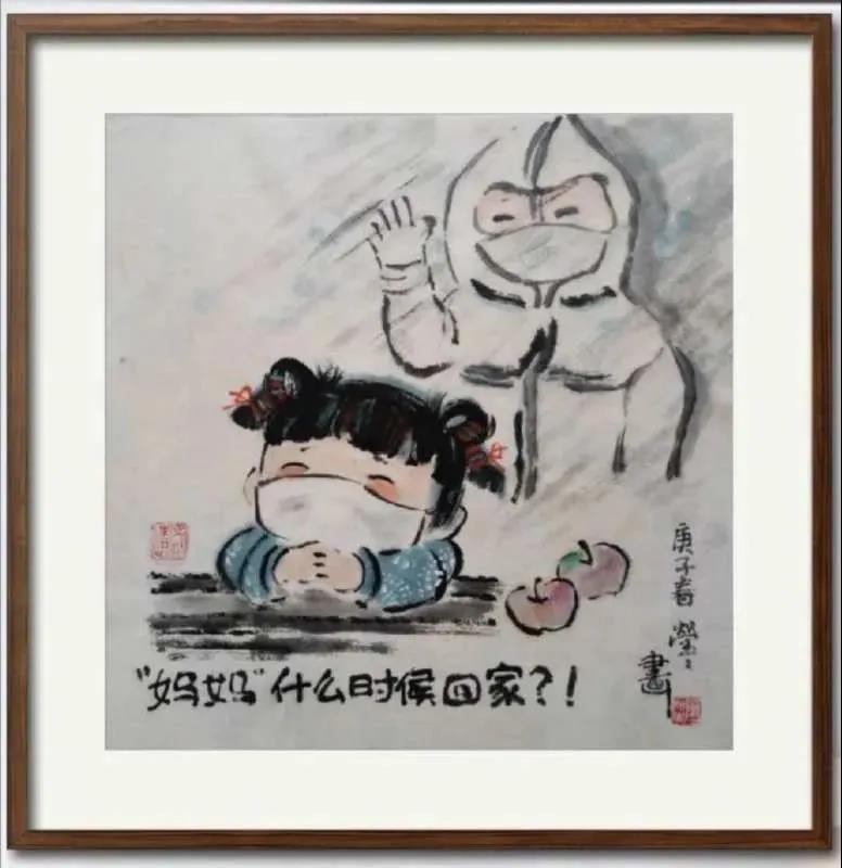 著名國畫品牌《中國娃娃》的作者、畫家楊瑩瑩創(chuàng)作了童心感人的《抗疫娃娃組畫》。談起創(chuàng)作緣起,她說:“2020年早春,我拿起筆,從孩子的視角看疫情,把我的所感、所想通過中國娃娃表達(dá)出來。”“在這次疫情中,孩子們經(jīng)歷了人間的大悲,也看到了人間的仁愛。他們天真無邪,童心異趣,充滿為人之初的真善。我用畫筆記下這段特殊的日子。”[2]