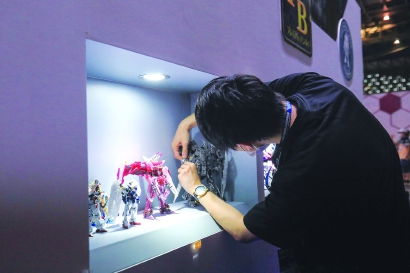 第十六屆中國國際動漫游戲博覽會今開幕,工作人員正加緊布展。 本報(bào)記者 葉辰亮攝