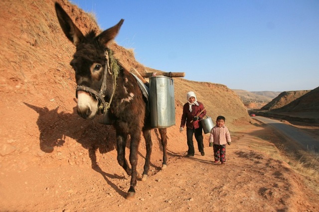 因?yàn)闃O度缺水,西海固人曾經(jīng)習(xí)慣了驢馱水(季正 攝)