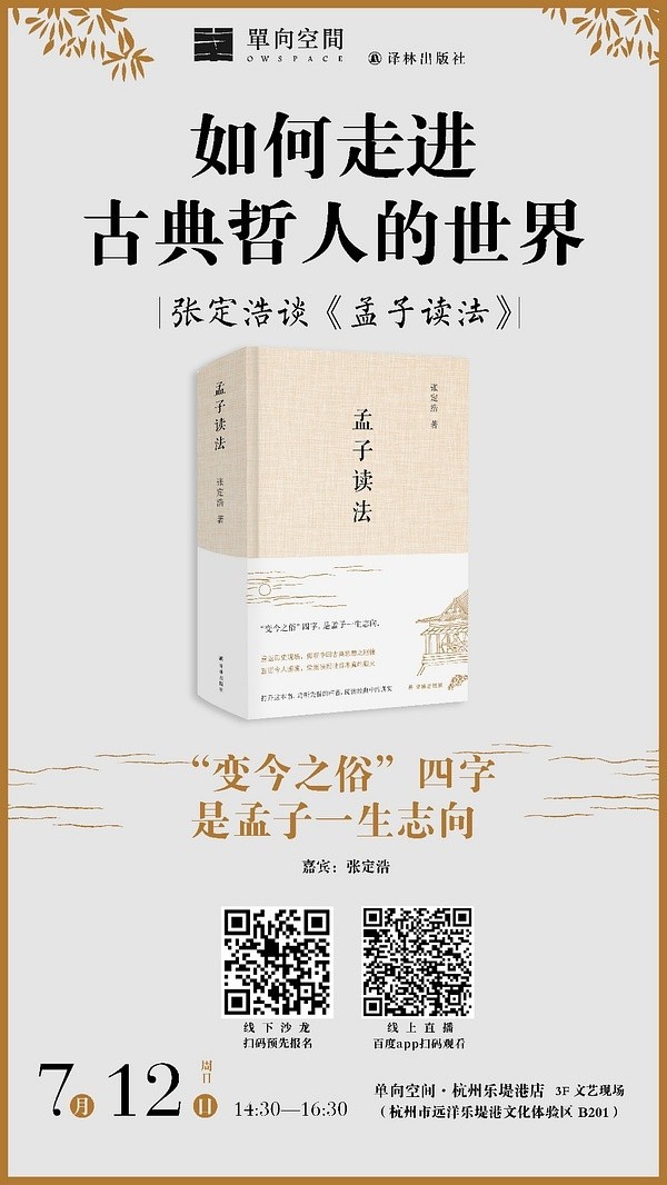 7月12日,張定浩帶著他的新書來(lái)到杭州,做客單向空間·杭州樂堤港店,與讀者分享自己對(duì)《孟子》及孟子其人的認(rèn)識(shí)。張定浩說(shuō),《孟子讀法》出版后一直未在上海做活動(dòng),此次特地在杭州舉辦第一場(chǎng)分享活動(dòng)再次說(shuō)明了他與杭州的緣分,早在《孟子讀法》之前,張定浩已經(jīng)寫過(guò)一本叫“孟子選讀”的小書,這本書正是由杭州出版社出版的。