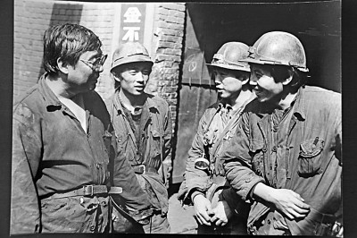 路遙(左一)在陜西銅川煤礦采訪。資料圖片