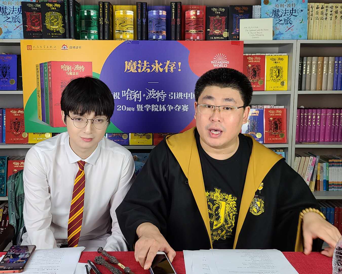 7月31日,即哈利?波特與該系列小說作者J.K.羅琳生日當天,由人民文學出版社聯(lián)合網(wǎng)易舉辦的“魔法永存——慶祝‘哈利?波特’引進中國20周年暨學院杯爭奪賽”活動通過微博平臺舉行,在線觀看“哈迷”超過90萬。中國出版?zhèn)髅焦煞萦邢薰径?、總?jīng)理李巖和人民文學出版社社長臧永清分別致辭,“哈利?波特”系列圖書的責任編輯王瑞琴、馬博和譯者馬愛農(nóng)與數(shù)十萬“哈迷”親密互動,分享20年間讀書感悟?;顒佑汕嗄暝u書演員郭鶴鳴主持。