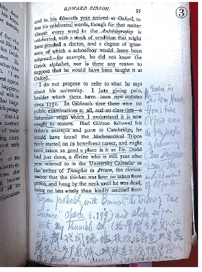 這段批注針對的正文,涉及吉本在牛津的學(xué)習時光,就是其《自傳》里談到過的。吉本十五歲時,“帶著足以迷惑一位博士的一大堆學(xué)問,同時也帶著足以使一名學(xué)童感到羞愧的愚蠢”,進入了大學(xué),他在馬格德林學(xué)院度過的十四個月,被稱作是“一生中過得最懶散、最沒有收獲的日子”。柏萊爾評價說,吉本時代的牛津大學(xué)體制還不健全,缺少公共考試制度,沒有班級名冊,但假如吉本步其父之后塵去了劍橋,那么他會發(fā)現(xiàn)數(shù)學(xué)甲等考試(Mathematical Tripos)這種障礙(與后來的制度不同,在吉本的時代,這場數(shù)學(xué)考試是劍橋?qū)W生獲得榮譽學(xué)位的唯一途徑)。我們想起錢鍾書并不杰出的數(shù)學(xué)成績,相信他一定慶幸進的是今天的牛津。因此,雖然這里討論的是牛津?qū)W風的衰敗,但也拉過劍橋來進行對照,批注里的 “bonnet blanc and blanc bonnet”是一句諺語,類如“半斤八兩”的意思。威廉·漢密爾頓(Sir William Hamilton,1788—1856)是一位蘇格蘭玄學(xué)家。在他的《哲學(xué)、文學(xué)與教育論叢》(Discussions in Philosophy,Literature and Education,1852)中,多處涉及對于牛津大學(xué)邏輯學(xué)課程衰落的批評。但錢鍾書應(yīng)該指的是他抄在筆記里的一段內(nèi)容(《外文筆記》,第32冊第45頁;Discussions,p.125):當時有人建議牛津取消邏輯學(xué)課程,引起眾多在校生的歡迎。漢密爾頓說,這些人長期以來都在狂熱地隨同圣安布羅斯一起祈禱:“主啊,把我們從亞里士多德的論辯術(shù)里解放了吧” (A dialectica aristotelis libera nos,Domine)。布魯諾的話是在他1583年訪問英國時候說的,(下轉(zhuǎn)6版)(上接5版)當時的牛津只重視神學(xué),新學(xué)說不受重視,被冷落的布魯諾因此給這所大學(xué)貼了這個標簽,我們今天在布魯諾寫的對話錄《圣灰星期三晚餐》(Cena de le Ceneri,1584)的第四篇結(jié)尾看得到這段原話(vedova delle buone lettere per quanto appartiene alla professione di filosofia e reali matematiche)。中間夾雜的中文舊體詩是錢鍾書留學(xué)期間的近作,曾在1935年11月發(fā)表于《國風半月刊》第七卷第四期,題為《賃廡臥病裁詩排悶》四首其三。大意是自愧所學(xué)所知大多卑瑣平庸,對照看來,此詩或許與初到牛津后對學(xué)術(shù)事業(yè)的感受頗有關(guān)系。而在讀書批注里抄入自己的詩作,這還是很罕見的。