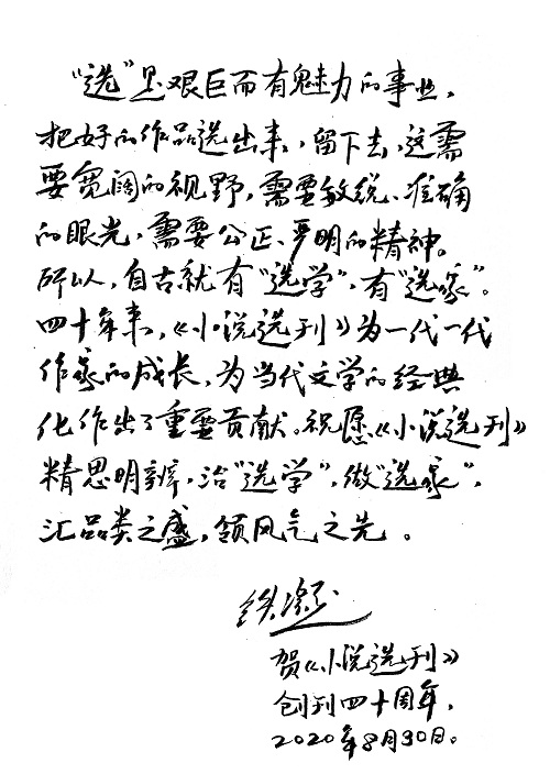 “選”是艱巨而有魅力的事業(yè),把好的作品選出來,留下去,這需要寬闊的視野,需要敏銳、準(zhǔn)確的眼光,需要公正、嚴(yán)明的精神。所以,自古就有“選學(xué)”,有“選家”。四十年來,《小說選刊》為一代一代作家的成長(zhǎng),為當(dāng)代文學(xué)的經(jīng)典化作出了重要貢獻(xiàn)。祝愿《小說選刊》精思明辨,治“選學(xué)”,做“選家”,匯品類之盛,領(lǐng)風(fēng)氣之先。