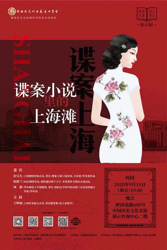 第41期陜西北路網(wǎng)文講壇定檔9月11日(周五),本期邀請(qǐng)網(wǎng)絡(luò)作家由寶兒、暗修蘭、華東師范大學(xué)副教授項(xiàng)靜、青年評(píng)論家王輝城一起聊聊諜案類型的網(wǎng)絡(luò)小說,以及青年一代網(wǎng)絡(luò)作家小說里描寫的上海往事、舊日城市。