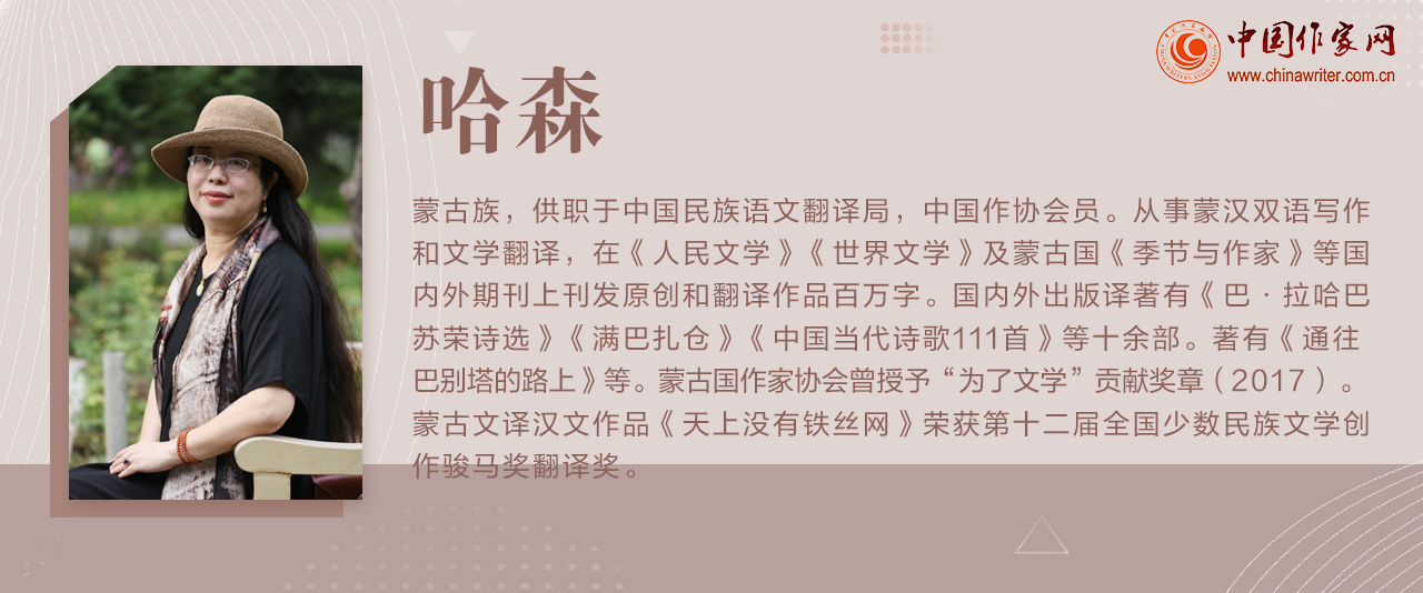我十五年如一日地進行文學翻譯,自始至終,全然是因為心靈的召喚,因為熱愛蒙古文化,熱愛我所選擇的文本。希望通過我的翻譯,讓更多的人們更深刻地了解草原上的一切,從而抵達各美其美,美美與共的大好境地。我選擇翻譯為事業(yè),此生無悔。