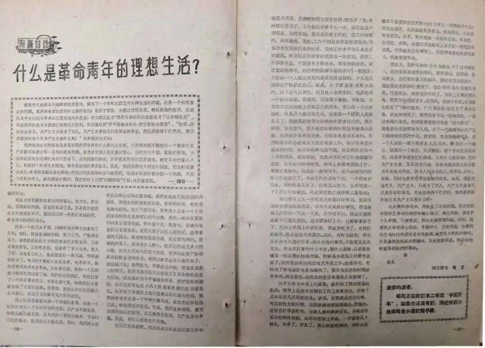 [80]肖文來(lái)信刊發(fā)于《中國(guó)青年》1960年第5期。該信未設(shè)標(biāo)題,這一組“問題討論”專輯的總標(biāo)題為“什么是革命青年的理想生活”。