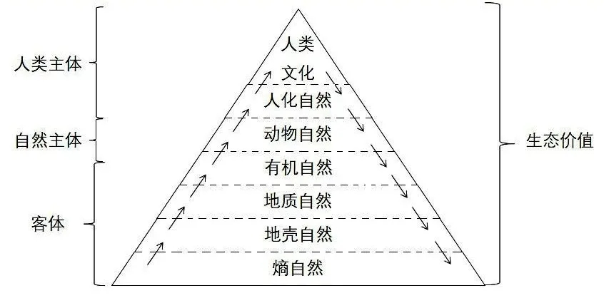 從進化論的角度來看,所有價值都源于創(chuàng)生的自然:“大自然是生命的源泉,這整個源泉,而不僅僅是誕生于其中的生命,都是有價值的,大自然是一切的起源?!比祟愇幕怯删哂兄黧w意識的人類創(chuàng)造出來的,它是大自然進化到高級階段的產(chǎn)物,因此在這一模型里,客體的自然價值處于最底層,人類文化創(chuàng)造的價值處于最頂層。自然進化過程中產(chǎn)生的價值之間是相互聯(lián)系的,有些價值完全屬于客體,有些則部分依賴于主體,而后者深深植根于前者之中,需要前者的支撐與維護。所以這個金字塔從下到上,價值的主體性增強,客體性減弱,且價值呈扇形逐步縮小。