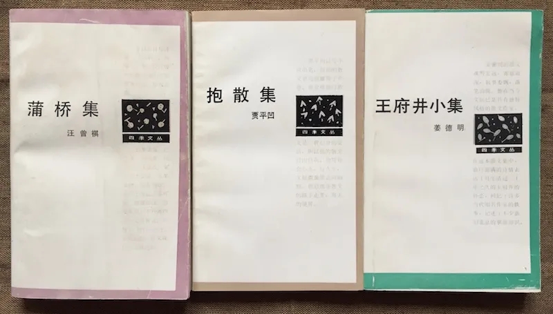 八十年代末到九十年代初,有幾套小開本值得一提:一是作家出版社的“四季文叢”,一套作家隨筆集。這套作為叢書,比較松散,扉頁、勒口或封底并沒有注明相關(guān)信息,用今天的標(biāo)準(zhǔn)來看,其實是難達(dá)標(biāo)的。據(jù)我所知,應(yīng)該出了四種,分別為汪曾祺的《蒲橋集》、賈平凹的《報散集》、姜德明的《王府井小集》和張承志的《綠風(fēng)土》,我收了前三種。素?zé)o記書帳習(xí)慣的我,惟那個時期,買書時會在扉頁上簽名,所以知道三本分別購于和平里書亭和海淀圖書城。這套書除了選文比較精當(dāng)(體現(xiàn)了作家社的專業(yè)標(biāo)準(zhǔn))之外,最大特點是質(zhì)樸大方,沒什么花里胡哨花的元素:封面近乎素白,書脊設(shè)計很鮮明,即使豎插在書架中,也不至于看漏。用紙雖不高級,但在那個時代也并不寒磣。