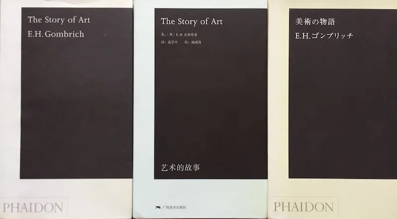E. H. 貢布里希著《藝術(shù)的故事》,英、中、日文版。英、日文版為英國菲登版,中文版為廣西美術(shù)版,連版式裝幀都原汁原味地從菲登引進(jìn),也是南大社瘦版小精裝的由來