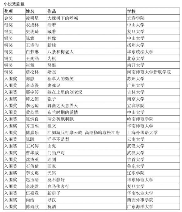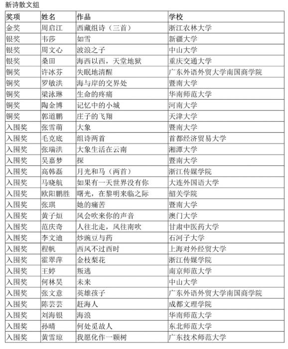 此次大賽2020年5月23日發(fā)布征稿啟事以來,共收到來自全國各地471所高校共計2053份作品,其中小說戲劇組稿件953篇,新詩散文組稿件1100篇。大賽組委會組織高校教授、作家、文藝評論家、資深編輯進(jìn)行初審、復(fù)審、終審三個環(huán)節(jié),三輪評審全程匿名,評審專家客觀對待每一個作品,保證結(jié)果公正。每組評選出金獎1名,銀獎3名,銅獎5名,入圍獎20名,共評出58件優(yōu)秀作品。