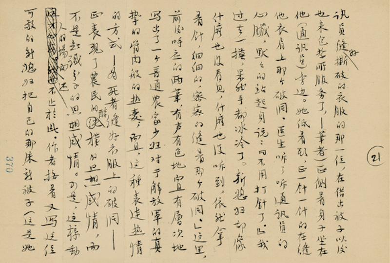 這一手稿是1958年寫的,我是搞畫史的,對文學史不是太了解,但里面有一個共通的現(xiàn)象,就是文藝為大眾服務越來越走向高潮,從這一手稿里面可以看出來。實際上當時有一個大背景,提倡寫短篇小說,別人容易看得明白,當時出了一批新作者,主要的目的是貼近生活。實際上從繪畫史的話,這些要求在畫史里面也存在的,這是可以相互參看的。