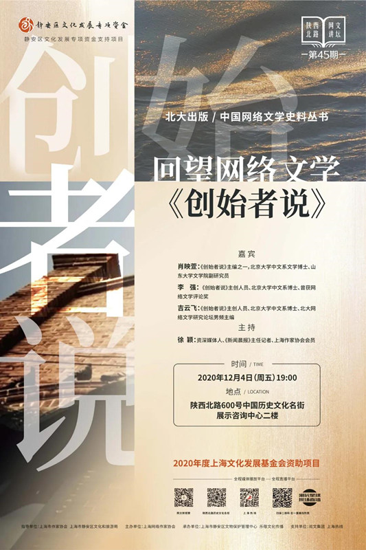 第45期陜西北路網(wǎng)文講壇特邀《創(chuàng)始者說》主創(chuàng)團(tuán)隊(duì)的北京大學(xué)中文系博士肖映萱、李強(qiáng)、吉云飛,特邀資深媒體人徐穎主持,對(duì)二十多年迅猛發(fā)展的網(wǎng)絡(luò)文學(xué)的源頭景象做一番回顧和剖析。