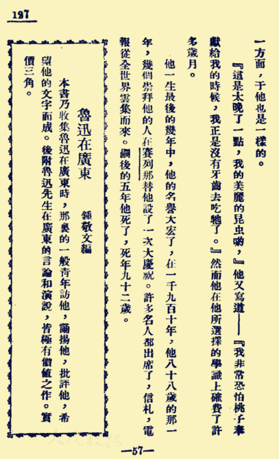 這樣一來,就只剩了別人所編的別人的文章,我當(dāng)然心安理得,無話可說了。但是,還有一層,看了《魯迅在廣東》,是不足以很知道魯迅之在廣東的。我想,要后面再加上幾十頁白紙,才可以稱為“魯迅在廣東”。