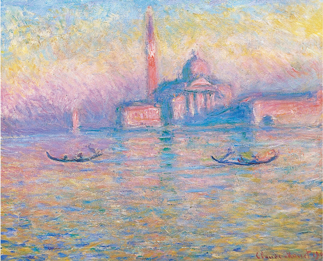 “威尼斯美景”這一部分,也許是在畫(huà)面與文字的相得益彰上,最讓我印象深刻的。因?yàn)椋惶岬侥蔚某鞘芯坝^題材的系列畫(huà)作,我們首先想到的是《魯昂大教堂》或《倫敦議會(huì)大廈》,當(dāng)然,它們是當(dāng)仁不讓的名作??墒牵苍S是因?yàn)樗鼈兲?,反而掩蓋了對(duì)其他佳作的欣賞和理解——威尼斯便是一例。作者鮮明地寫(xiě)到,“在莫奈展開(kāi)創(chuàng)作的所有城市中,威尼斯于他而言,算得上是危險(xiǎn)的,因?yàn)樗耆幌氲羧脒@座古老城邦常有的軼事風(fēng)格與情緒主義的陳詞濫調(diào)當(dāng)中”;就著那美輪美奐的圖畫(huà),他繼續(xù)寫(xiě)道,“通過(guò)對(duì)光線(xiàn)的巧妙運(yùn)用,為創(chuàng)作對(duì)象蒙上一層虛無(wú)縹緲的面紗,賦予現(xiàn)實(shí)場(chǎng)景以觸不可及的夢(mèng)幻質(zhì)感”。為了說(shuō)明莫奈在威尼斯的創(chuàng)作過(guò)程,作者還引用了見(jiàn)證者艾麗絲的記錄,讓我們更加貼近了藝術(shù)家作畫(huà)的那個(gè)瞬間?!妒讨巍ゑR焦雷島》《達(dá)里奧宮》……這些之前被忽視的畫(huà)作在你的面前綻放了光彩,它們似乎用顫動(dòng)的光影、瀲滟的波紋、閃爍的色彩,講述著既稍縱即逝又永恒綿延的美。