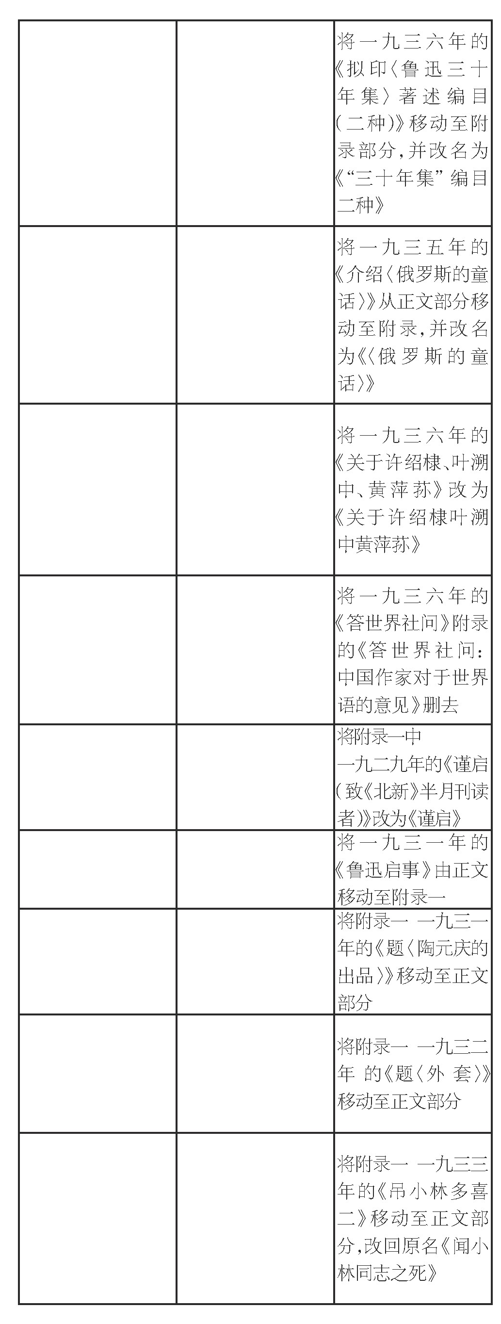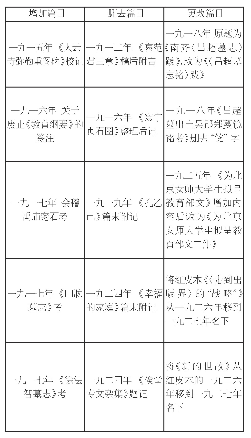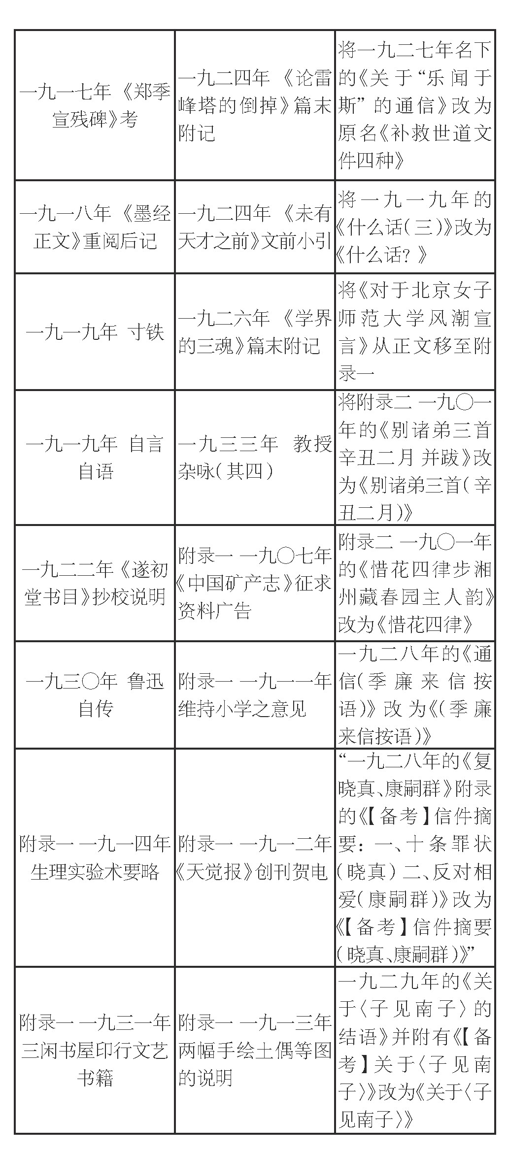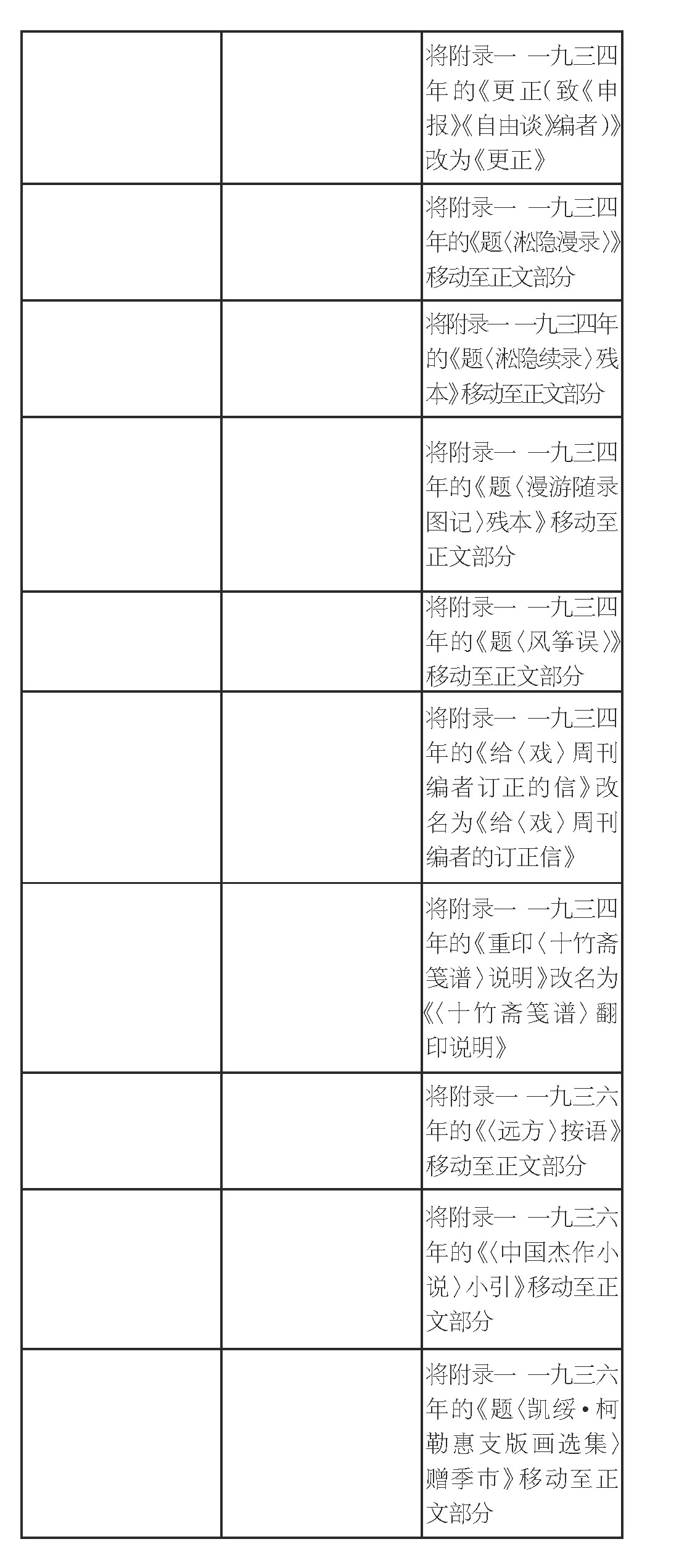 《集外集拾遺補編》篇目的變動分為三種情況——增、刪、改,數(shù)量依次遞增:增加篇目14篇,刪除篇目23篇,更改篇目42篇。更改篇目又可細分為更改標題、調(diào)整順序、調(diào)整篇目位置。更改標題25篇,如《南齊〈呂超墓志〉跋》改為《〈呂超墓志銘〉跋》,這是編注者代擬標題的情況。另一種則是恢復(fù)原有的標題。如將一九二七年的《關(guān)于“樂聞于斯”的通信》改為原名《補救世道文件四種》。調(diào)整順序6篇,根據(jù)發(fā)表時間重新排列篇目順序,如將《〈走到出版界〉的“戰(zhàn)略”》《新的世故》從一九二六年移到一九二七年名下。