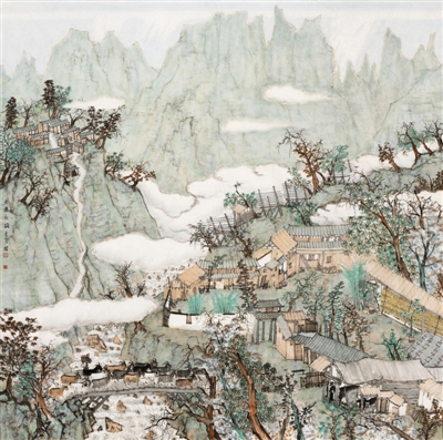 “美麗的事業(yè)·中國國家畫院扶貧主題美術作品展”上展出的何加林中國畫《老寨新韻》。