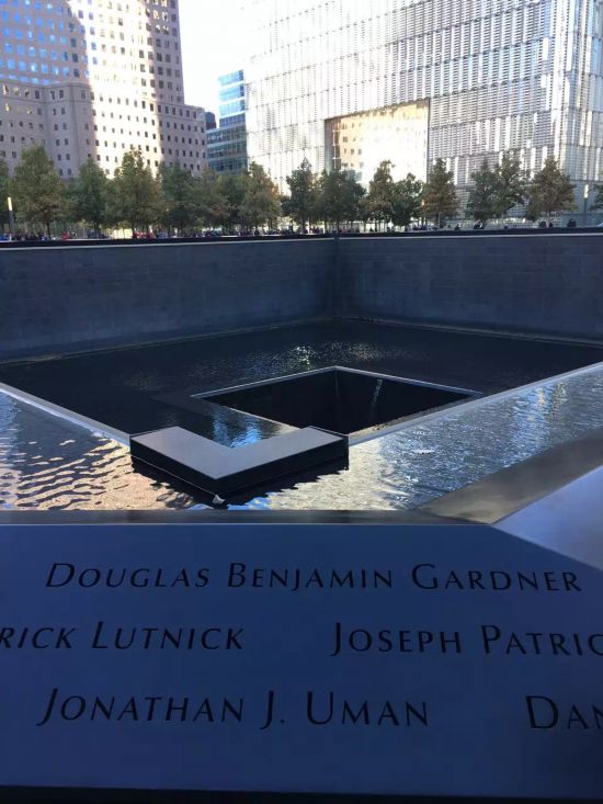 緩緩流淌的水,是那些曾經(jīng)鮮活的生命。紀念噴泉池那莊重的黑色大理石和深入地下的池底,是凝重的祭奠,讓那天逝去的人們在死亡中得享尊嚴。