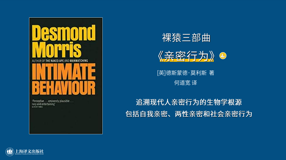 今年全新亮相的社科新書系“譯文科學(xué)”將推出英國著名動物學(xué)家、生物人類學(xué)家德斯蒙德·莫利斯暢銷全球2000余萬冊的經(jīng)典之作“裸猿三部曲”。莫利斯以嚴(yán)謹(jǐn)?shù)目茖W(xué)態(tài)度和貫穿一生的觀察研究,通過《裸猿》《人類動物園》《親密行為》三部作品向人類宣稱:人,不是從天而降的天使,而是由地而生的猿猴。