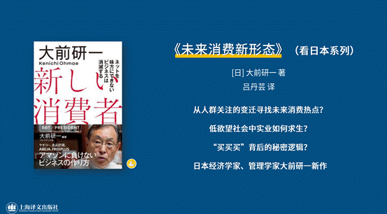 日本觀察方面,日本經(jīng)濟(jì)學(xué)家、管理學(xué)家大前研一的又一日本觀察力作《未來消費新形態(tài)》將于今年與讀者見面。作為《低欲望社會》的姊妹篇,大前研一在該書中基于敏銳的社會透視,提出日本“低欲望社會”形勢下的新經(jīng)濟(jì)對策。他提出了“不能善用網(wǎng)絡(luò)的商家將退出歷史舞臺”,分析了經(jīng)濟(jì)形勢下出現(xiàn)的新問題:急速增長的共享經(jīng)濟(jì)、偶像經(jīng)濟(jì)、從物品消費向體驗消費的轉(zhuǎn)變等。