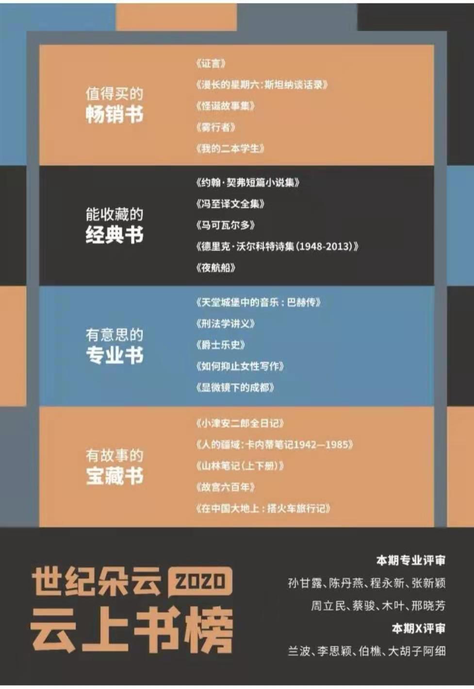 從2020年9月起, “云上書榜”至今已經(jīng)評選出六期榜單。年榜評選范圍是2020年出版的圖書,候選書單由前六期的上榜圖書和評審們的補(bǔ)充書單組成。最終評選出4大類別共20本上榜圖書。其中,“值得買的暢銷書”是《證言》《漫長的星期六:斯坦納談話錄》《怪誕故事集》《霧行者》《我的二本學(xué)生》;“能收藏的經(jīng)典書”是《約翰·契弗短篇小說集》《馮至譯文全集》《馬可瓦爾多》《德里克·沃爾科特詩集(1948-2013)》《夜航船》;“有意思的專業(yè)書”是《天堂城堡中的音樂 : 巴赫傳》《刑法學(xué)講義》《爵士樂史》《如何抑止女性寫作》《顯微鏡下的成都》;“有故事的寶藏書”是《小津安二郎全日記》《人的疆域:卡內(nèi)蒂筆記1942—1985》《山林筆記(上下冊)》《故宮六百年》《在中國大地上 : 搭火車旅行記》。