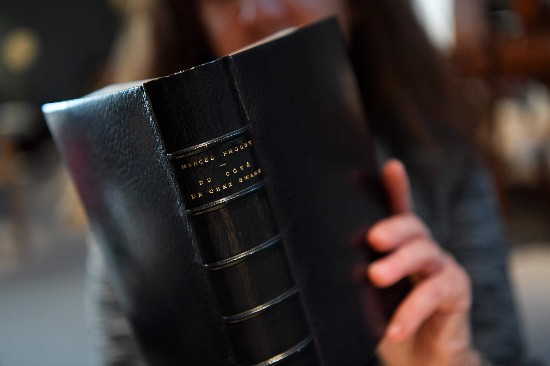 當(dāng)?shù)貢r(shí)間2017年10月30日,法國(guó)巴黎,一名參加拍賣會(huì)的婦女拿著《追尋逝去的時(shí)光》第一部的復(fù)制品。 視覺中國(guó) 資料圖