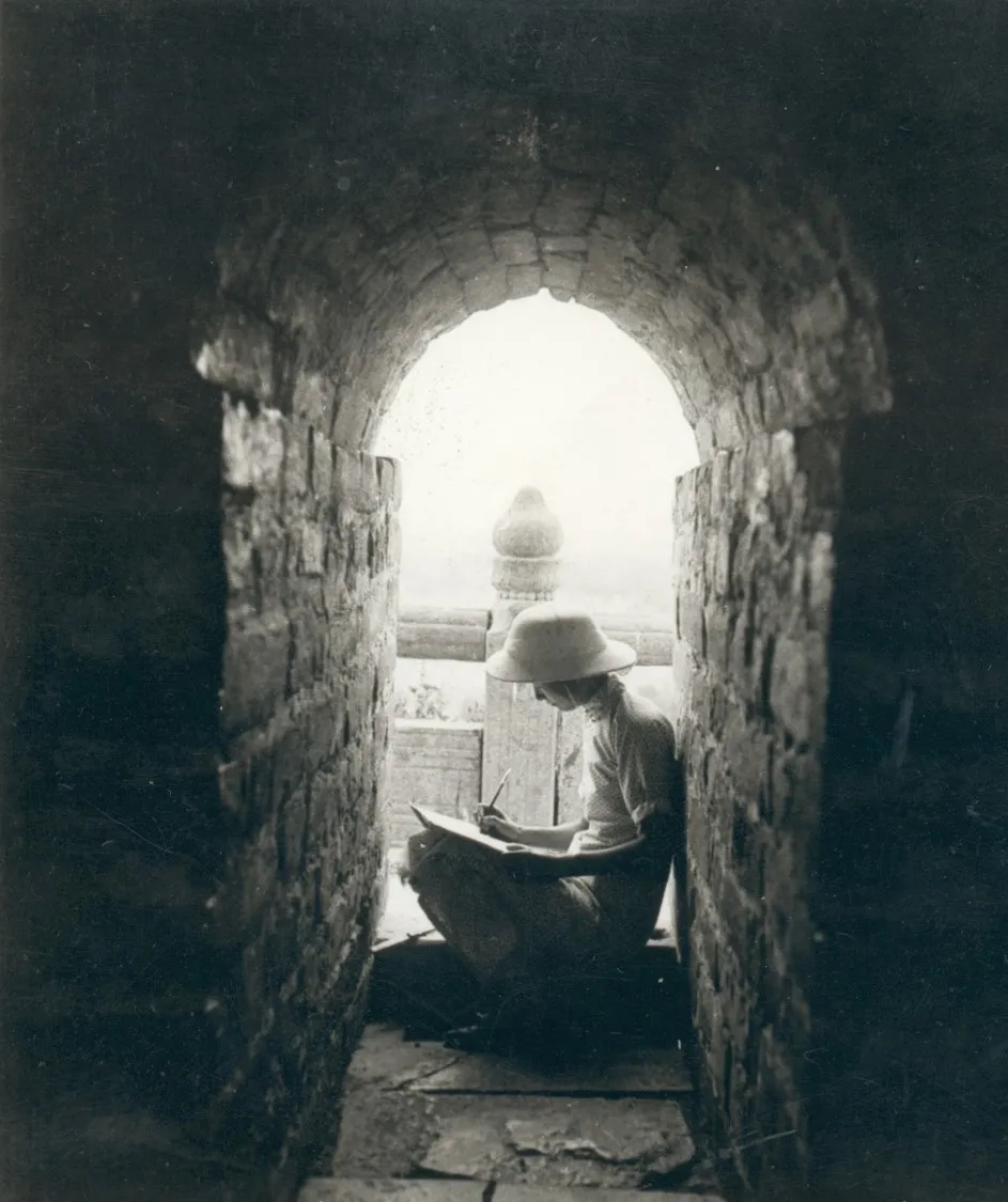 林徽因后來(lái)經(jīng)常抱怨梁思成,整個(gè)蜜月下來(lái)沒(méi)給她拍幾張像樣的照片。因?yàn)榱核汲删褪桥慕ㄖ臅r(shí)候把她帶上,當(dāng)作一個(gè)尺度人,我們一般叫作scale(標(biāo)尺),這一點(diǎn)在這張照片里體現(xiàn)得淋漓盡致,用她烘托建筑的宏偉。