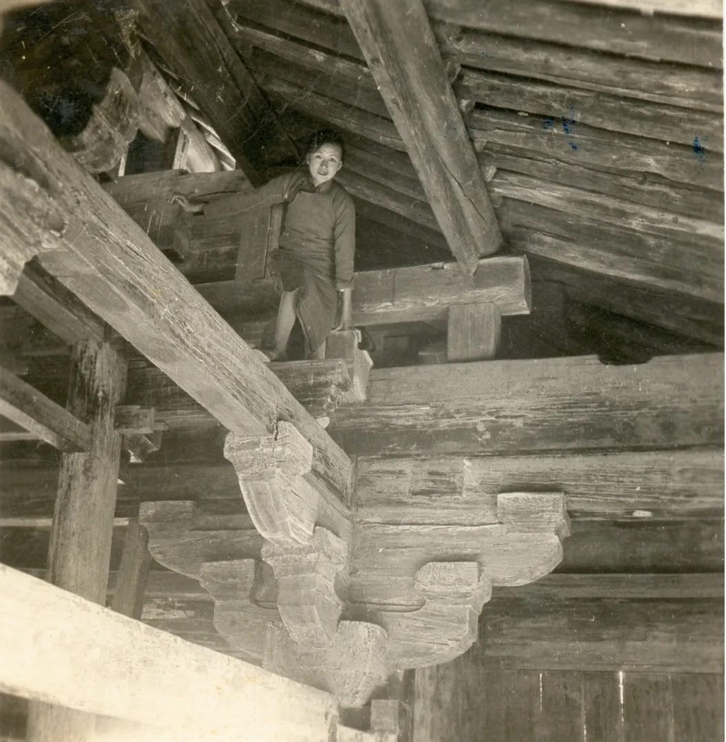1933年林徽因在河北正定開(kāi)元寺鐘樓梁架上